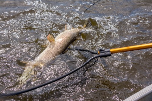 A fish this size is delicate and often will not survive the fight without help. Holding it by the tail, I move its body back and forth, flowing water through the gills. A minute or two, and the great northern pike strokes its tail free of my hand and swims away with power. I hope to catch that one again next year.
