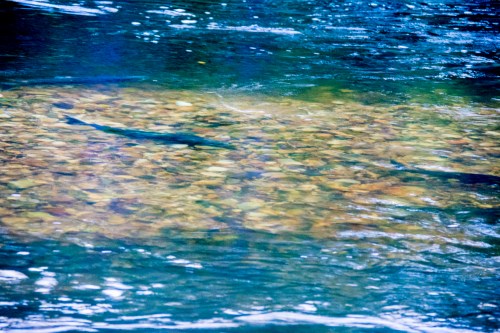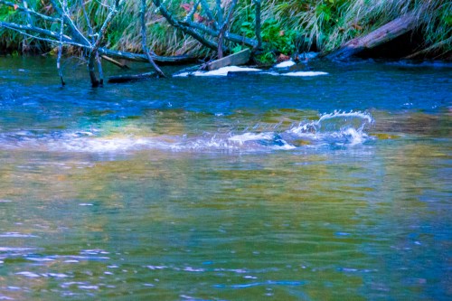 All around me, big Salmon leap clear of the water. They make spectacular splashing displays as they motor across shallow gravel flats, all but their bellies entirely visible above the waterline. As I watch, one leaps an embankment and beaches itself. Really! I wade over to coax it back in the river.