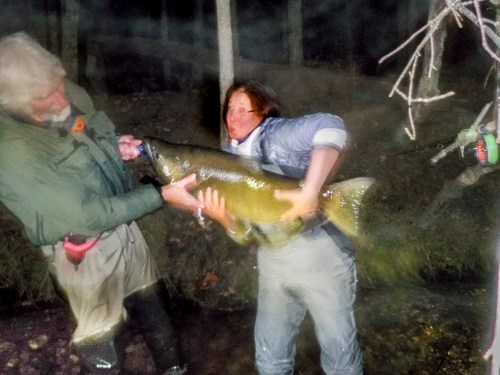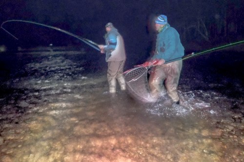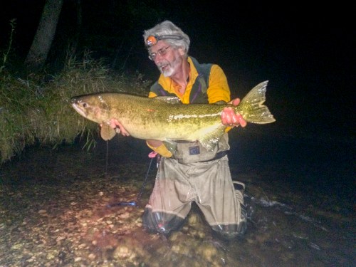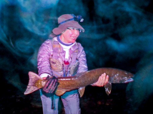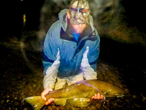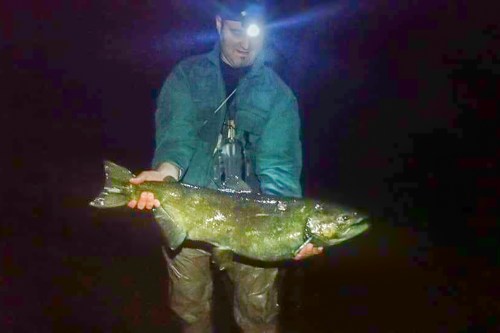 Now he moves onto the shallow gravel and thrashes at the surface not twenty feet away. I see him in the beam of my headlamp. He’s huge—maybe 30 pounds!