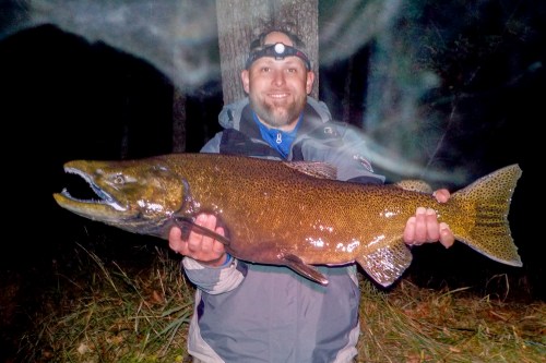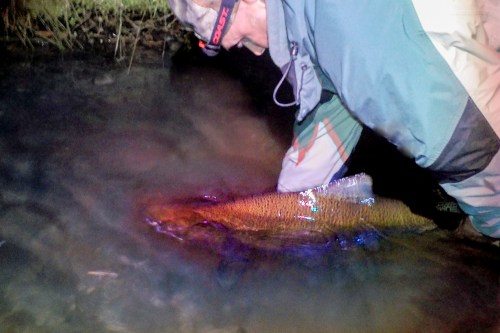 At 10:00 pm, Bueter again leads the group out on the river. It’s another cool night and fog from the river reflects my headlamp and obscures my vision. We explore a mile upstream and find several pods of large aggressive Kings.