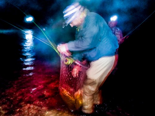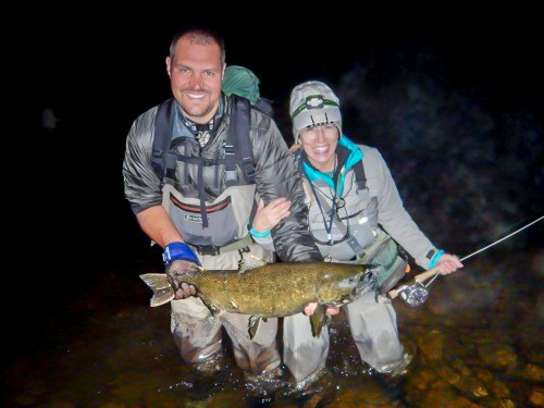 I arrive early to get more time on the water and on this first night, I wade the river’s currents alone. Here in the dark forest night, I peer about in the eerie glow of my headlamp at pods of rising dorsal fins. In this river, my quarry averages 20 pounds but some run twice that size.