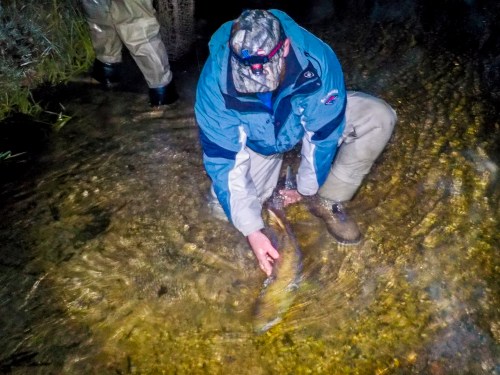 Bueter takes the group out on the water about 10 pm. I can see my breath. Fog rises from the water’s surface. It’s unusually cold and tonight the air temperature drops to 35˚F, but my waders along with a hoodie and rain jacket keep me snug and cozy.