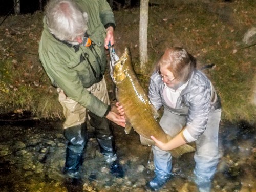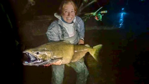 It feels like time to turn in when Bueter’s shouts my name. I wade upstream to find Jen bending over a huge Salmon, nursing it back to swimming strength. Fishermen surround her, flashing photos.