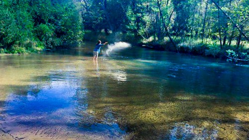 I know I’ll lose him if he gets into that tangle of wood, so I wade downstream across a shallow gravel flat and tug him away from the hazard. He responds with another show of watery gymnastics, then moves back to that same deep hole. It’s his special hiding place, but this time I’m fighting him from the downstream side and I have the advantage. My pressure adds to that of the current. I’m tiring the fish.