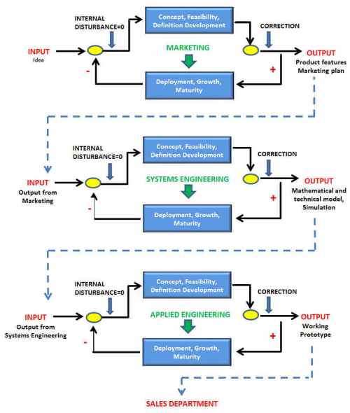 - SYSTEMS ENGINEERING DEPARTMENT: Translates the marketing requirements into engineering concepts, tests their feasibility (simulation), and produces the required technical maps and schematics to be able to create a working prototype. Its input is the output from Marketing. Its output is the technical representation of the product, including mathematical and simulation results, schematics, and mock-ups. This becomes the input for Applied Engineering.