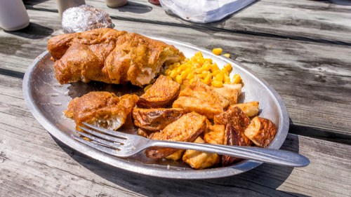 But shore lunch is the grandest treat of all. Our guide chops wood, builds a fire, then cleans and cooks the walleye we just caught. Ah shore lunch! Beer batter walleye, honey garlic walleye, sweet and sour walleye.