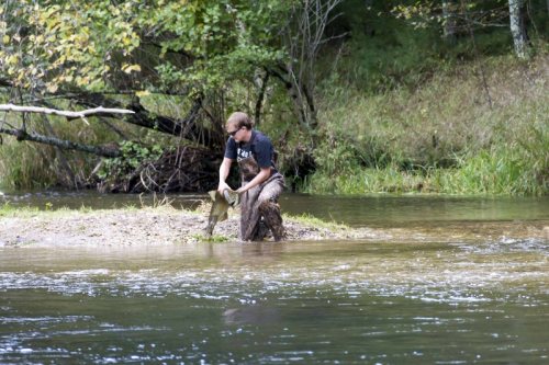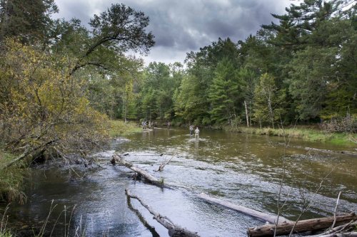 Every September, thousands of salmon swim upstream to spawn in the rivers feeding the Great Lakes. They show up, nice and prompt, as if they scheduled an appointment—like they carefully set a loud alarm on their smart phone calendars so they wouldn’t stand you up. The greatest of these waterways is Michigan’s wild, beautiful, and legendary Pere Marquette River in the Manistee Forest. Fly fishing only. Catch and release. So guess why there’s so many fish.